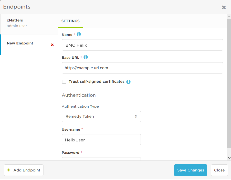 You can configure additional endpoints to use different authentication details, or to target a different URL than that of the default xMatters endpoint.