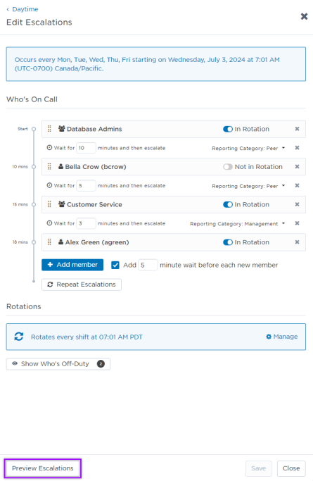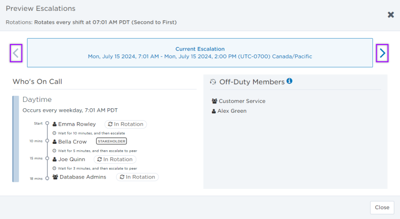 To ensure a shift escalates and rotates members as expected, you can preview the escalation timeline for current and future rotations. The preview contains information about the configured rotation, shift members (such as names, if they're in rotation, or if they're a stakeholder), wait times, and off-duty members.