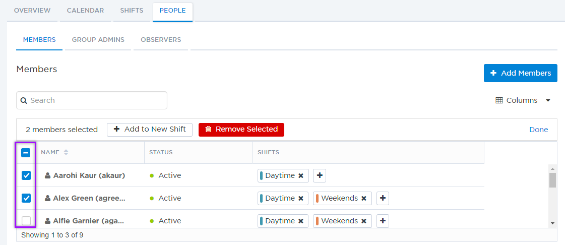 If a member already belongs to the group and you want to assign them to another shift, first locate their name in the Members column. Click the plus symbol (+) in the Shifts column, and then select a shift from the list.