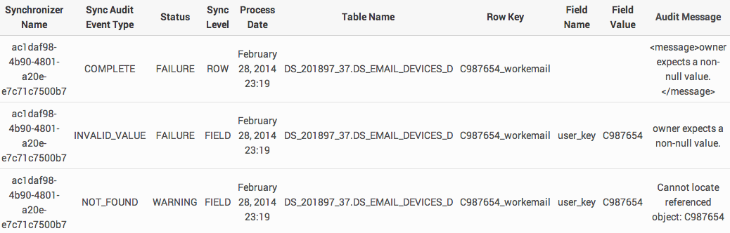 | Sync Audit Event Type | A description of the type of warning or error that is being logged. |