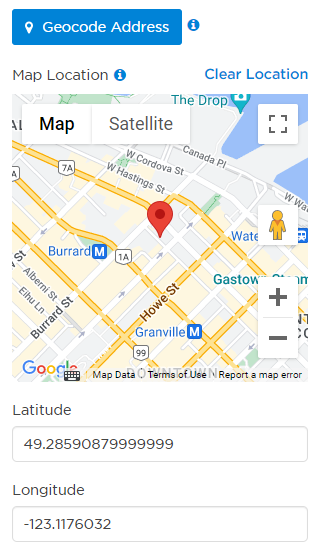 - Optionally, geocode the site's location manually by clicking Geocode Address (you can alternatively geocode multiple sites at a time from the sites list). The site's latitude and longitude coordinates are updated automatically based on the World Geodetic System Standard. If required, drag and drop the pin that appears on the map to a more precise location or click Clear Location to remove the geocode.