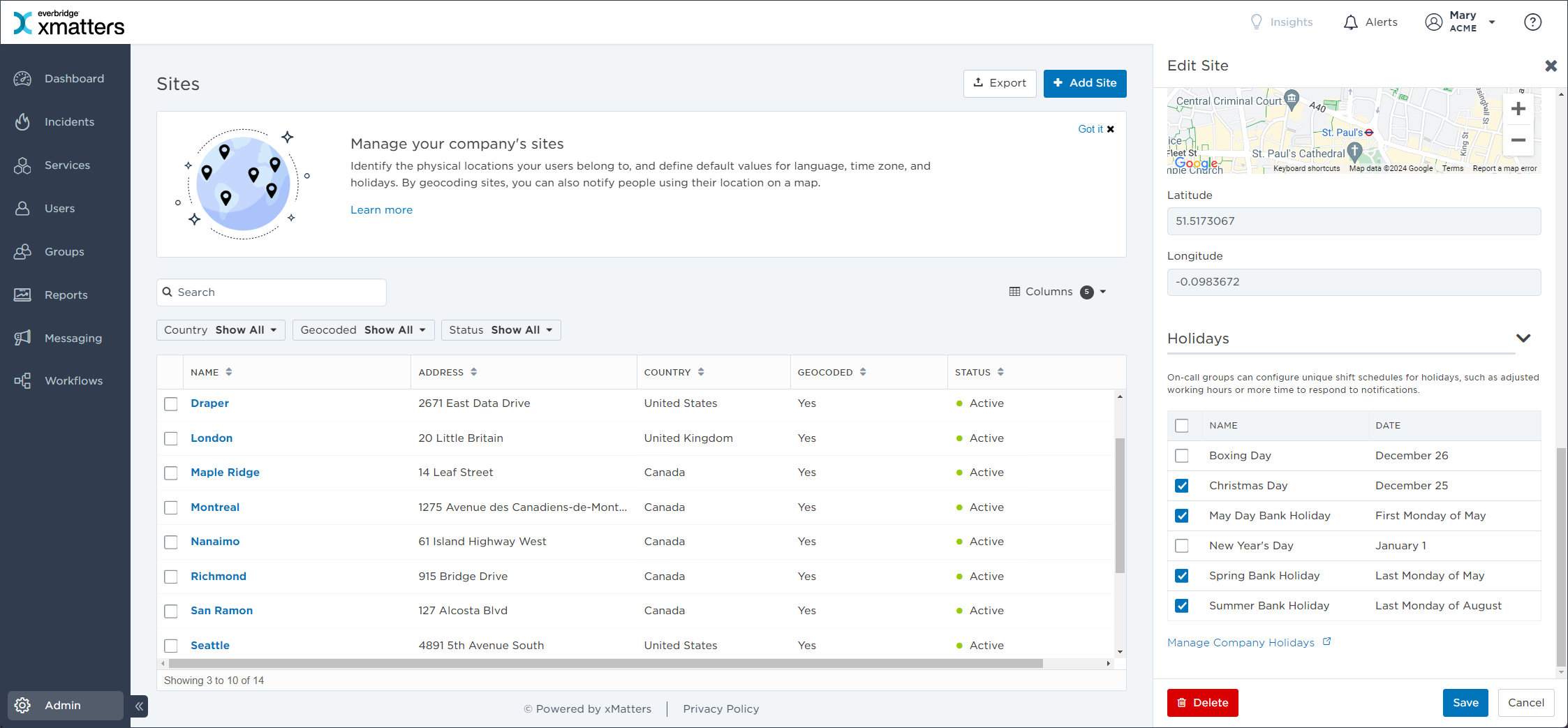 In xMatters, sites represent physical locations like street addresses or geographic coordinates. Every user in the system belongs to a single site and it controls some default settings on their profile page, such as their language and time zone.