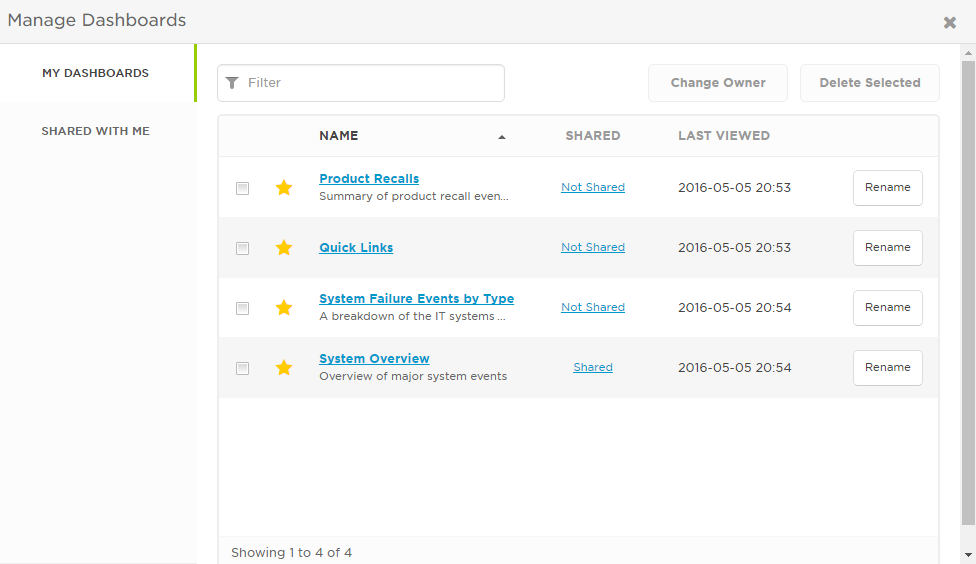 The Manage Dashboards window allows you to view any dashboard that you own or is shared with you, including dashboards that are not starred, and perform advanced dashboard management tasks such as sharing dashboards and assigning them to another owner.