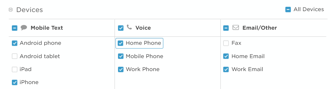 - Next, we'll edit the default devices. The underlying form only sends notifications to work phone and email devices. However in a SEV-1, it's a greater priority to get a hold of people right away, so we add text, home phone, and home email devices.