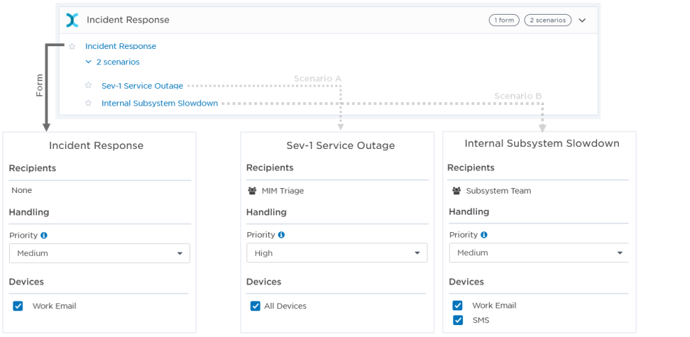 - Scenario B: Internal Subsystem Slowdown: Sets the priority to Medium and targets the applicable service team on work email and text (SMS) devices when your monitoring systems notice that an internal service is getting bogged down.