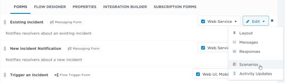 - If you have manage or editor permissions for the scenarios and sender permissions for the form, you can access scenarios through the form's messaging page.