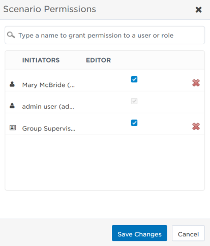 - If you also want the initiator to be able to edit scenarios, select the check box in the Editor column.