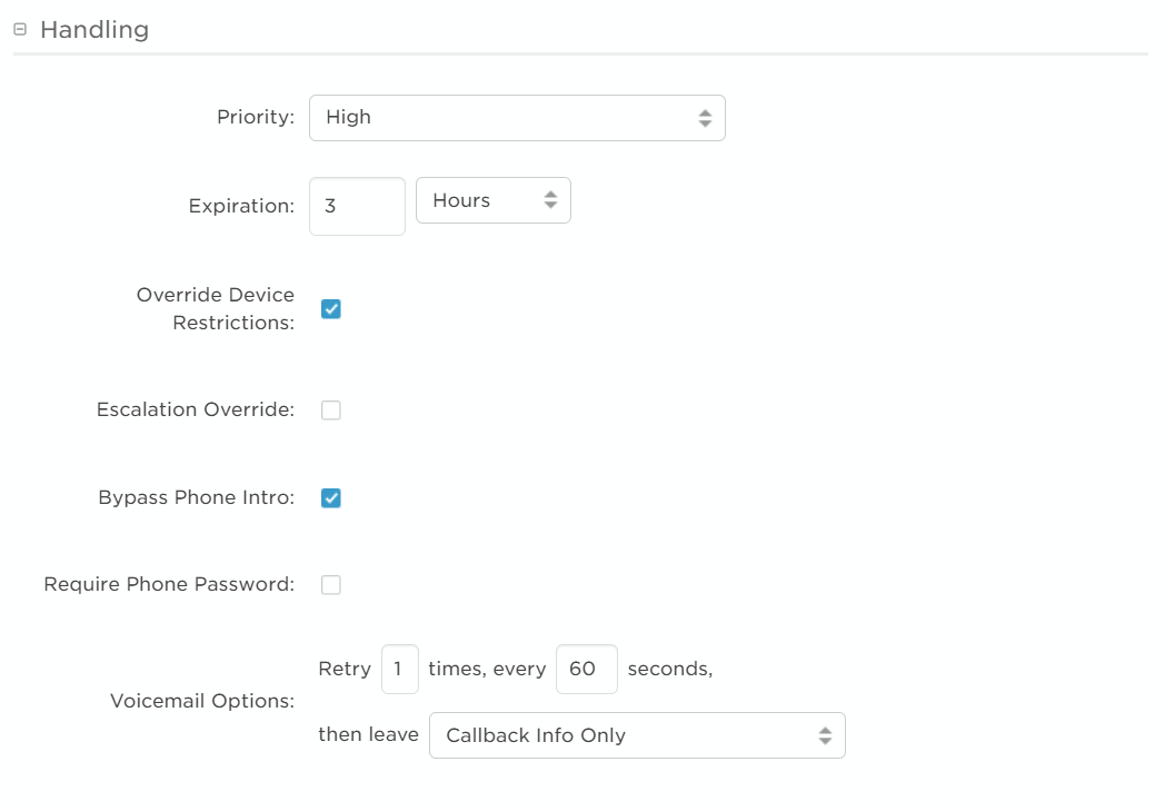 - We'll also change the handling options slightly to set the priority to High, and to override device restrictions and the phone intro to get the people we need involved as soon as possible.