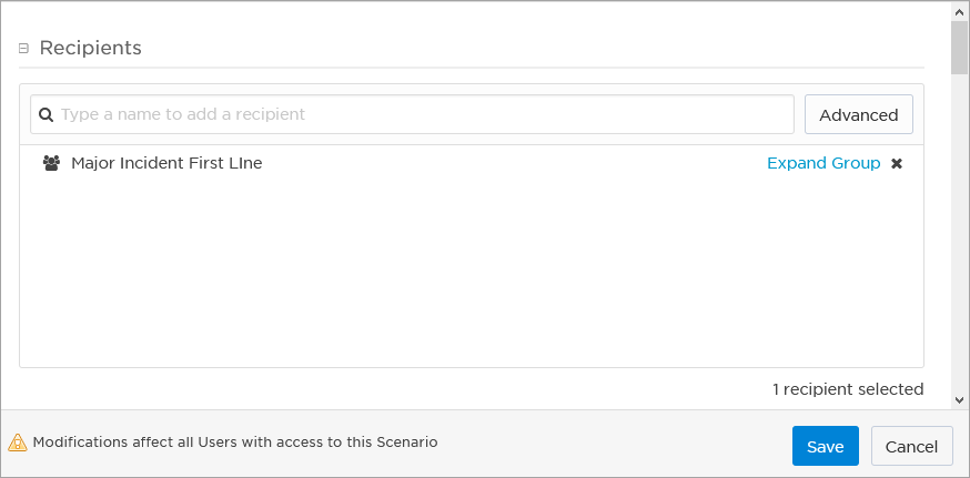 - And lastly, because this is a SEV-1, we set our major incident first line team as a default recipient. To add a single user, group, or dynamic team as a recipient, type the name into search bar and select from the drop-down menu. To add multiple recipients or devices, click Advanced.
