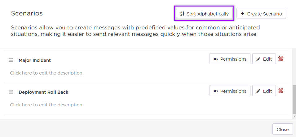 - To sort the list of scenarios in alphabetical order (A-Z), click Sort Alphabetically. (You can't reverse this action, but can manually change the order once sorted.)