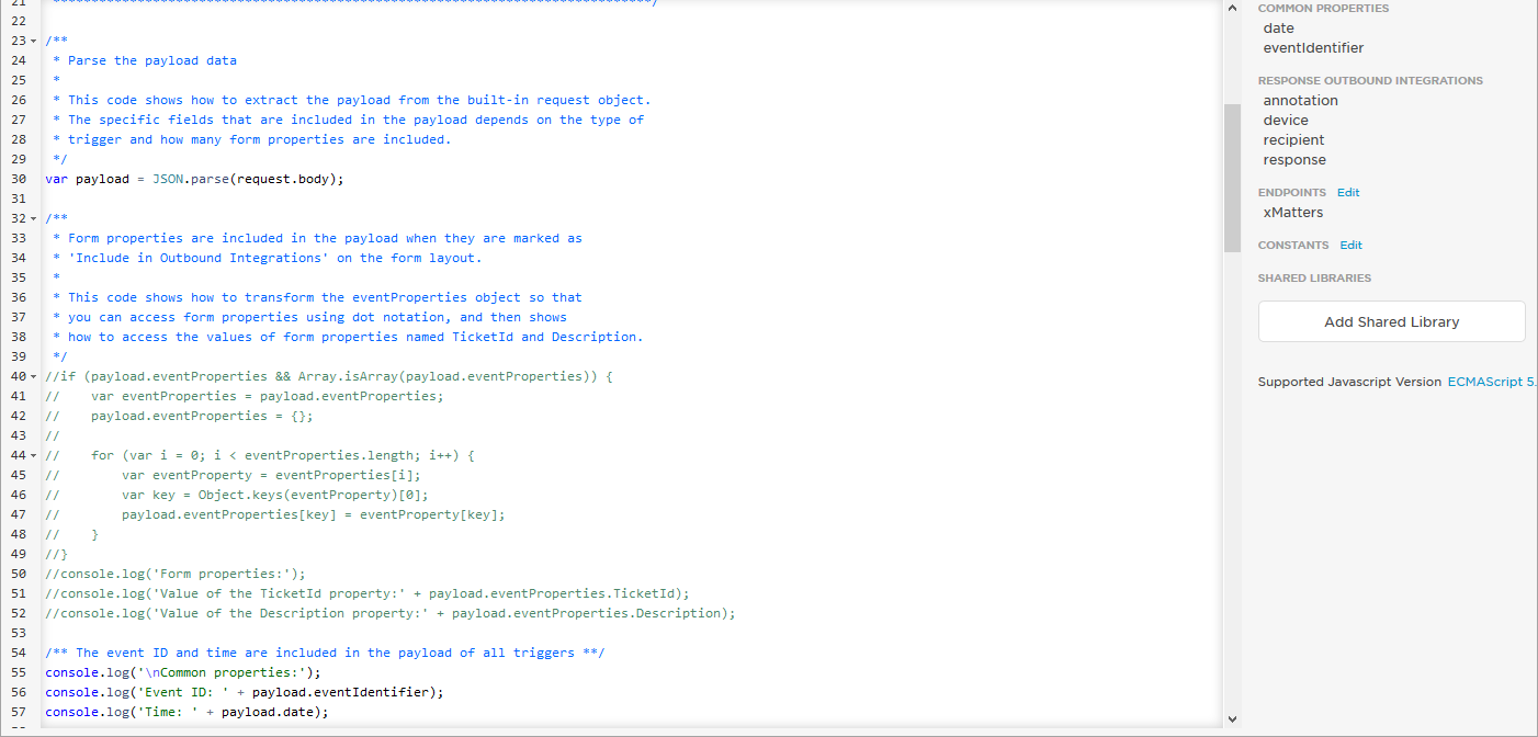 In the Integration Builder, we click the name of our outbound integration to edit it, and then click Edit Script. The Transformation Script Editor contains the default transformation script that was generated when we created our integration. The sample code provides examples of how to perform common tasks required by outbound integrations: