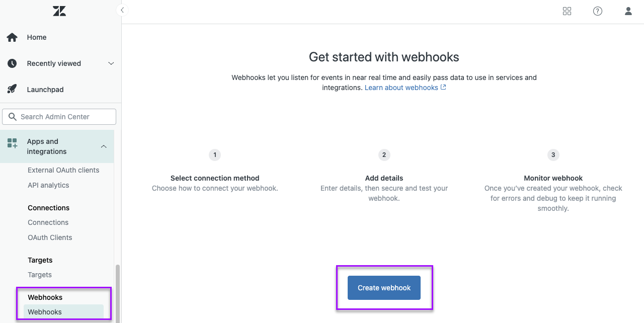 - Open the Zendesk Admin Center, expand Apps and Integrations, then select Webhooks.