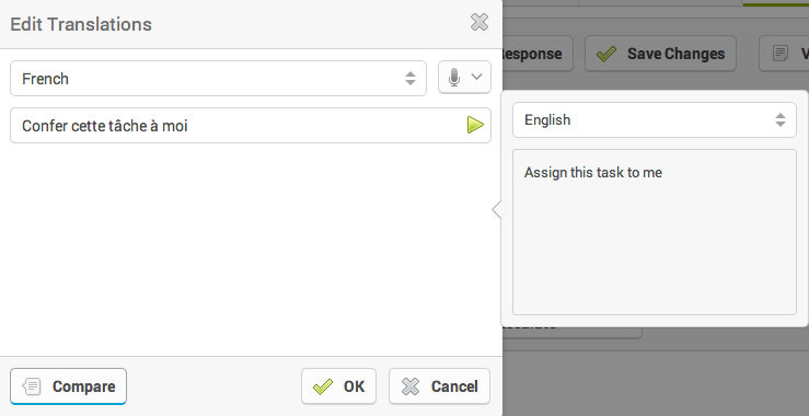 You can also specify voice translations for other languages, including creating and searching for recordings (via the Edit Translations options available from the settings drop-down icon). You can click Compare to display the phrase in any languages available to the xMatters company. To create a recording in another language, select the desired language, and then click the microphone icon and select Add Recording.
