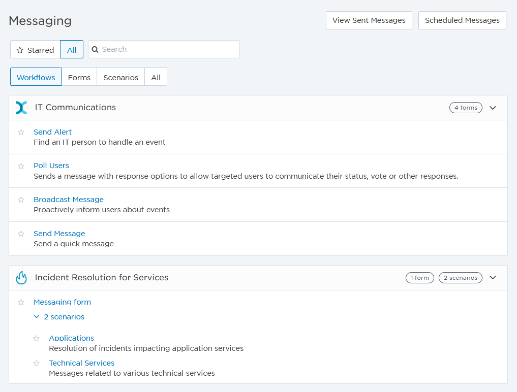 - Workflows: Expandable list of workflows that indicates how many forms and scenarios are contained within each workflow. Click the name of a workflow to expand its contents. The order of workflows on the Messaging screen is determined on the Workflows page.
