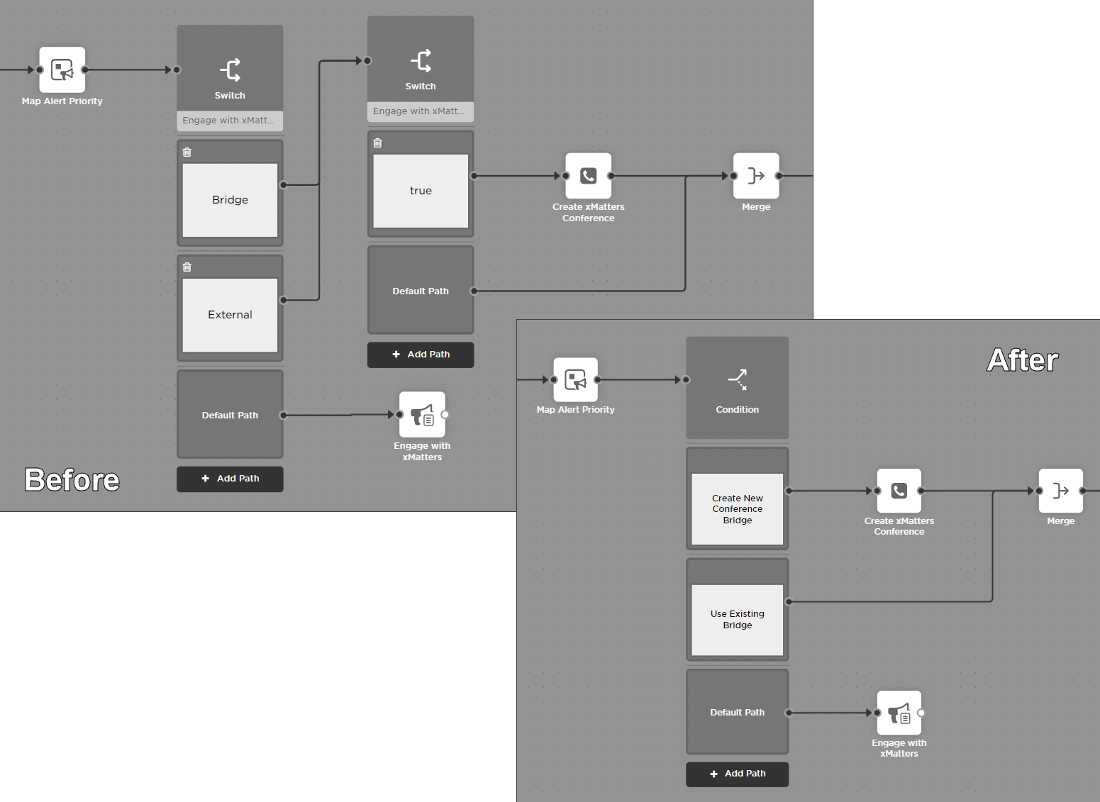 As another example, here's how a single condition step can replace two switch steps in our ServiceNow integration's 'Engage with xMatters' workflow.