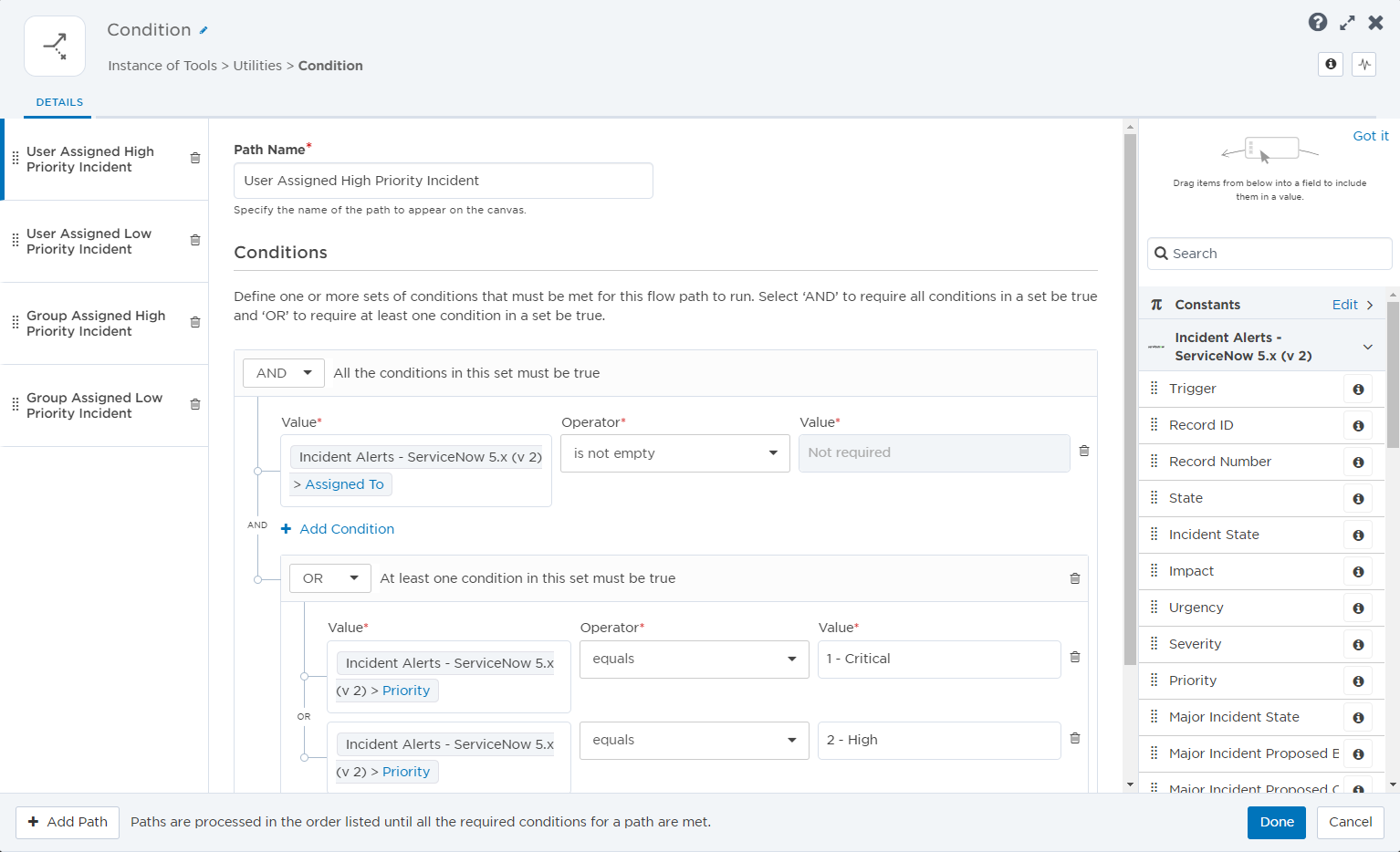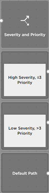 - Click Add Path on the setup screen or on the canvas to add more paths and set the conditions, operators, and values that determine if the flow follows a specific pathway (for example, if you want the flow to take one path based on 'High' severity and priority less than or equal to '3', and another based on 'Low' severity and priority greater than '3', add paths for both cases).