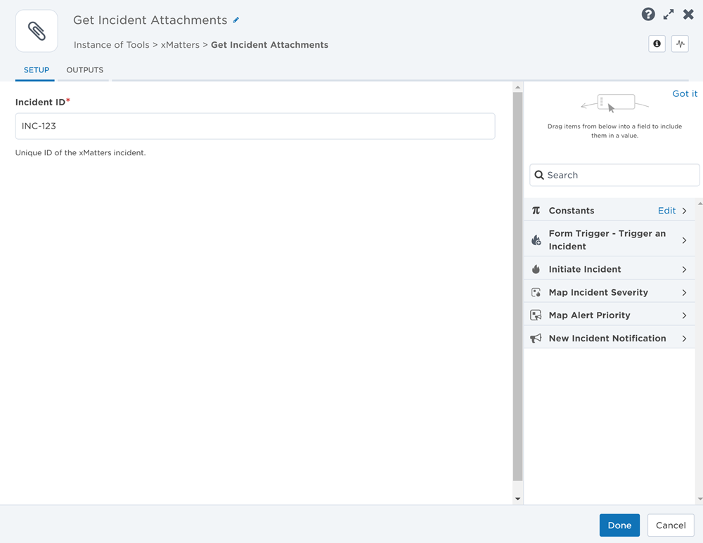 - In the Tools tab, go to the xMatters section and drag the Get Incident Attachments step onto the canvas and connect it to your flow.