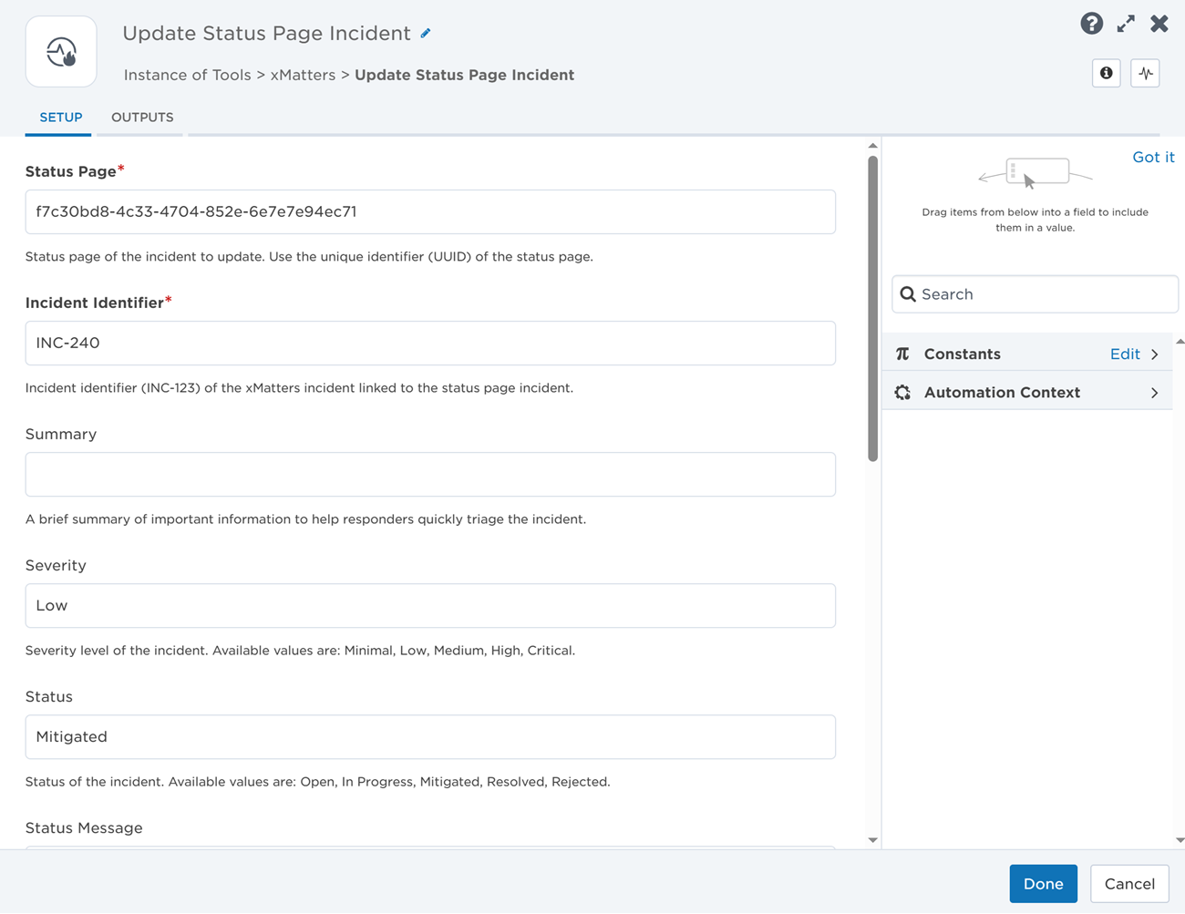 - In the Incident Identifier field, enter the incident ID of the xMatters incident linked to the status page incident.